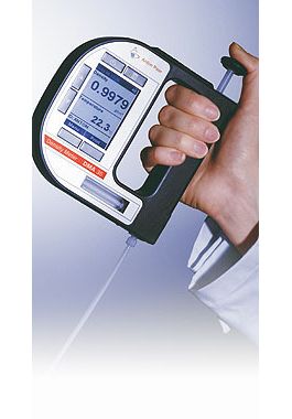 Anton Paar bringt ein neues tragbares Dichtemessgerät auf den Markt – technologisch zukunftsweisend. Das neue DMA 35 misst die Dichte oder Konzentration Ihrer Probe in einem Messbereich zwischen 0 g/cm3 und 3 g/cm3. Die sieben benutzerfreundlich angeordneten Tasten sorgen für leichtes Navigieren innerhalb des Menüs, auch mit Schutzhandschuhen. Sobald eine Probe in ein DMA 35 eingefüllt wird, wird die Beleuchtung der Messzelle und des LC-Displays automatisch eingeschaltet, damit man die Werte auch in dunkler Umgebung gut ablesen kann. Das DMA 35 kommuniziert kabellos mit einem Drucker oder PC über IrDA, und eine weitere Produktversion ist sogar zusätzlich mit einer RFID-Schnittstelle ausgestattet, die eine Probenidentifizierung über RFID-Tags ermöglicht.