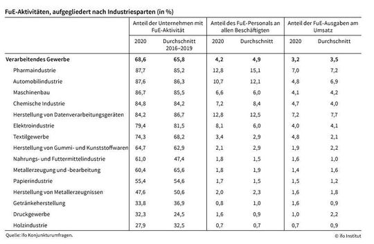 Dennoch setzen viele Unternehmen auch während der Krise auf Forschung und Entwicklung. Der Anteil der Firmen, die angeben, Forschung und Entwicklung zu betreiben, sei von 65,8 auf 68,6 Prozent aller Unternehmen gestiegen. Allerdings sei der Anteil der Beschäftigten in Forschung und Entwicklung zurückgegangen. Über alle Branchen hinweg rutschte er ab von 4,9 Prozent im Schnitt der Jahre 2016 bis 2019 auf 4,2 Prozent im vergangenen Jahr. Spitzenreiter ist hier die Pharmabranche mit 12,8 Prozent 2020, allerdings nach 15,1 Prozent im Schnitt der Vorjahre.