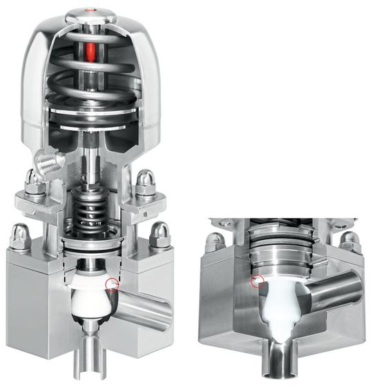 Auch eine sehr hohe Schaltwechselzahl und eine präzise Dosierung lassen sich mittels PD-Technologie durchführen, so der Hersteller. Und das ohne die bekannten Nachteile herkömmlicher Sitzventile, bei denen durch den sogenannten Aufzugeffekt an der Ventilspindel Medium in die Dichtpackung transportiert wird. Die deutlich verringerten Toträume, z.B. im Gegensatz zu denen eines Faltenbalgs, sind ein weiterer Vorteil und begünstigen eine effektive Reinigbarkeit des medienführenden Bereichs.