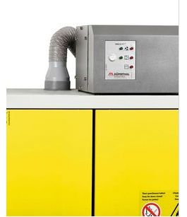 Alternativ haben sich bei Sicherheitsschränken für Lösemittel ATEX-konforme (2014/34/EU) Umluftfiltersysteme in der Praxis bewährt.
