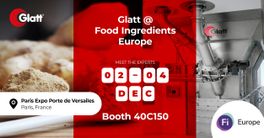 Besuchen Sie uns vom 2. bis 4. Dezember 2025 in Paris auf der Fi Europe. Das Glatt Team demonstriert am Stand 40C150 wie Sie die funktionellen und technologischen Eigenschaften Ihrer Ingredients gezielt einstellen können.