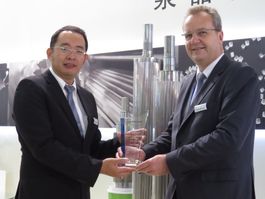 Thomas Willemsen überreichte Chew Phenghuat vor Kurzem bei der ChinaPlas in Shanghai einen besonderen Kristallglas-Pokal zum fünften Jubiläum des Tochterunternehmens.