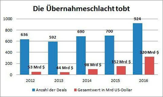 Wenn es mit dem Wachsen aus eigener Kraft nicht werden will, wird eben zugekauft: 197 Transaktionen ab US $ 50 Millionen mit einem Volumen von US $ 219,6 Milliarden zählte PWC 2016.