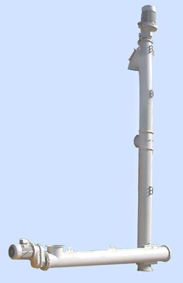 Die horizontale Zuführschnecke, die Material aus einem Silo oder Trichter austrägt oder es, nachdem sie von einem vorgeschalteten Dosierorgan beschickt wurde, zur Vertikalschnecke befördert, besteht aus einem U-Profiltrog aus Normalstahl mit einem, dem Einsatz entsprechenden Oberflächenfinish. Der Auslaufbereich besteht in jedem Fall aus einem kurzen Rohrteil, welches im rechten Winkel auf den unteren Rohrabschnitt der Vertikalschnecke geflanscht ist. An den beiden Enden der horizontalen Zuführschnecke ist jeweils ein Verbindungsflansch angeschweißt. Der Trog/Rohrtrog umschließt eine rotierende Schneckenwendel mit Wellenverbindungen an beiden Enden zu den Wellenzapfen der Endlagereinheiten. Die horizontale Zuführschnecke kann je nach ihrer Gesamtlänge mit einem oder mehreren Zwischenlagern ausgestattet sein. Des weiteren ist die Schnecke mit einem, für den jeweiligen Einsatz geeigneten Antrieb ausgerüstet.